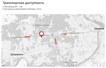 Объект находится в Нижегородской области, в г. Джержинск в 1 км от трассы М7 и в 20 км от границы Нижнего Новгорода, имеет удобные выезды на федеральные трассы.