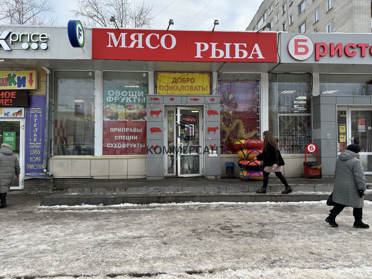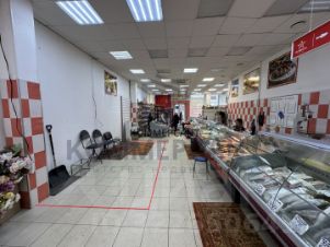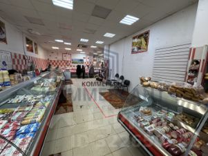 Основной профиль торговли в этом помещении продукты питания (мясо, рыба, кондитерские изделия), есть также и непродовольственные товары.