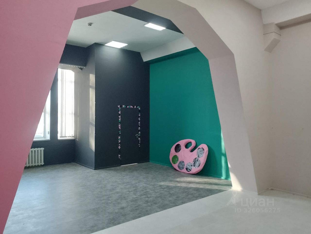 Помещение однообъёмное, светлое, высокие потолки, большие окна, несколько санузлов на этаже, кафе.