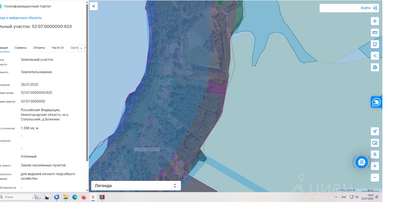 Нижегородская область, м.о.Сокольский, д.Боженки, общей площадью 1288 кв.м., кадастровый номер 52:07:0000000:920, разрешенное использование для ведения личного подсобного хозяйства