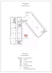 Расположен на 7 этаже, имеет смешанную планировку (открытое пространство + кабинетная нарезка), свой санузел на этаже. Два лифта и две лестницы.