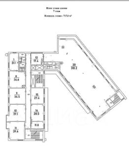 Офис расположен на 7-ом этаже. В здании два лифта. Общая площадь этажа 717,1 кв.м. Этаж разделен на два блока. В одном блоке свободная планировка open space, кухня для сотрудников и два санузла. В другом блоке коридорная система. Расположены 8 кабинетов площадью от 11 до 40 кв.м.