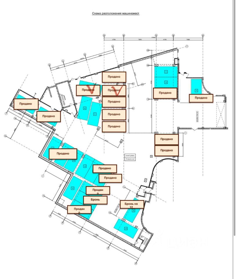 Сдается семейное парковочное место для 2-х машиномест в подземном паркинге элитного жилого дома. Места отмечены галочками на схеме.