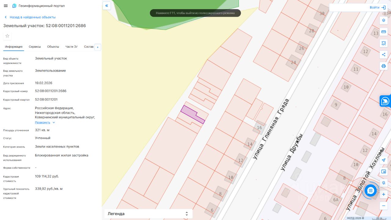 - разрешенное использование блокированная жилая застройка - категория земель земли населенных пунктов - площадь земельного участка 321 кв.м. - кадастровый номер - 52:08:0011201:2686