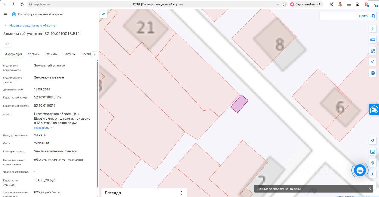 Адрес: Российская Федерация, Нижегородская область, р.п.Шаранга, примерно в 12 метрах на север от д.2 пер.Некрасова, площадью 24 кв.м., кадастровый номер 52:10:0110016:512, вид разрешенного использования объекты гаражного назначения, категория земель - земли населенных пунктов