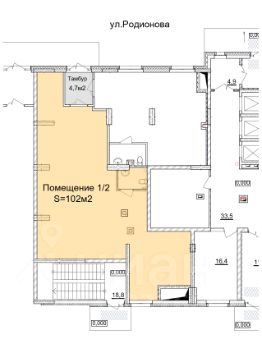 Торговое помещение 102 кв.м. на 1 этаже нового 25-этажного жилого дома, расположенного на одной из центральных улиц города Родионова.