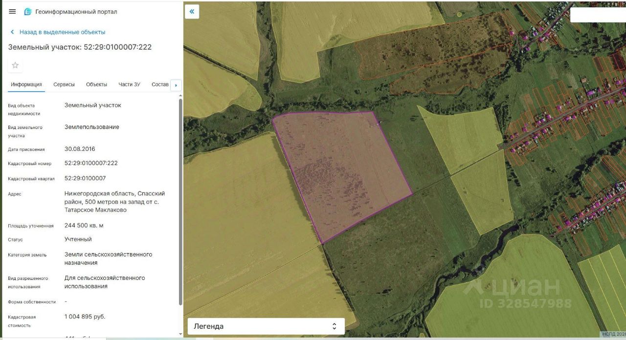 Лот 3 Земельный участок с кадастровым номером 52:29:0100007:222 , из состава земель сельскохозяйственного назначения, площадью 244500 кв.м, местоположение: Нижегородская область, Спасский район, 500 метров на запад от с. Татарское Маклаково, разрешенное использование для сельскохозяйственного использования