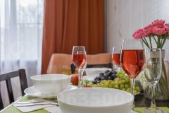 - Полностью оборудованная кухня: современная плита, чайник, микроволновая печь, холодильник, посуда и столовые приборы, фильтр-кувшин.