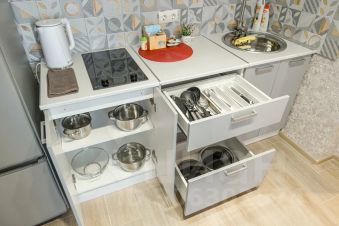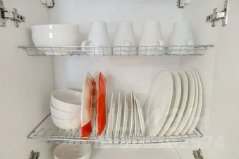 Гладильная доска, сушилка, утюг, фен, бытовая техника, чайник, стиральная машина, СВЧ печь, посуда и кухонная утварь.