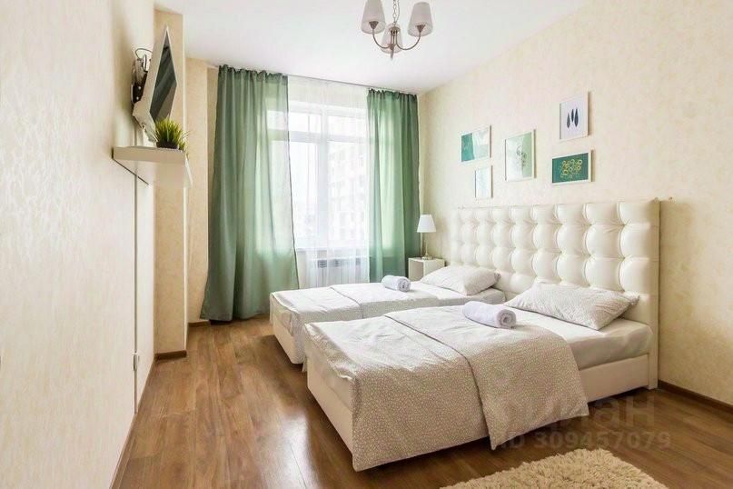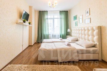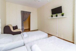 Дизайн комнаты выполнен в светлых тонах. Окно из спальной выходит на чистый, зеленый двор. В комнате стоят две удобные кровати с белоснежным хлопковым бельем, которые можно соединить и превратить в одну двуспальную. В спальной установлен плазменный телевизор с подключенным кабельным.