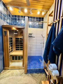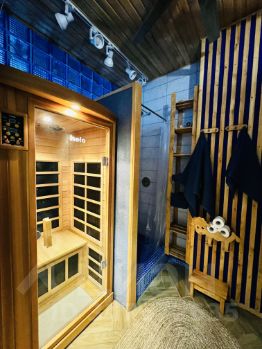 Несмотря на небольшую площадь,здесь есть полноценная кухня с современной бытовой техникой,гостиная зона с удобной мягкой мебелью ,камином и игровой приставкой, волшебная кровать как из сказки, ванная комната с инфракрасной сауной и душевой.
