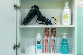 Фен для волос, тапочки, зубные наборы, расческа (моем и дезинфицируем после каждого гостя), ватные диски, ушные палочки, средство для снятия макияжа, средства для чистки обуви, туалетная бумага, освежитель воздуха.