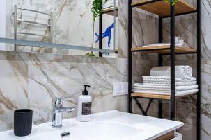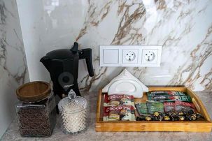 - Полностью укомплектованная кухня: индукционная плита, посудомоечная машина, чайник, гейзерная кофеварка, духовка, микроволновая печь, холодильник, посуда и столовые приборы, фильтр-кувшин