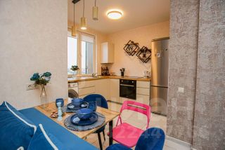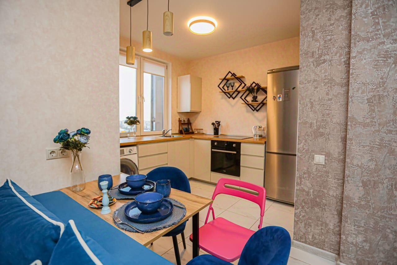 Квартира с просторной кухней - гостиной и спальней. В апартаментах: имеется необходимая для комфортного размещения мебель и техника: стиральная машина, холодильник, плита, духовка, микроволновка, угловая акриловая ванная, шторы блек аут. лоджия с мебелью. Две двуспальных кровати с ортопедическим матрасом, двуспальный диван moon разместят с комфортом до 6 взрослых гостей. Кабельное тв, скоростной интернет wi-fi. В квартире есть постельное бельё и полотенца, тапочки, посуда, чай, сахар, гель для душа и шампунь.
