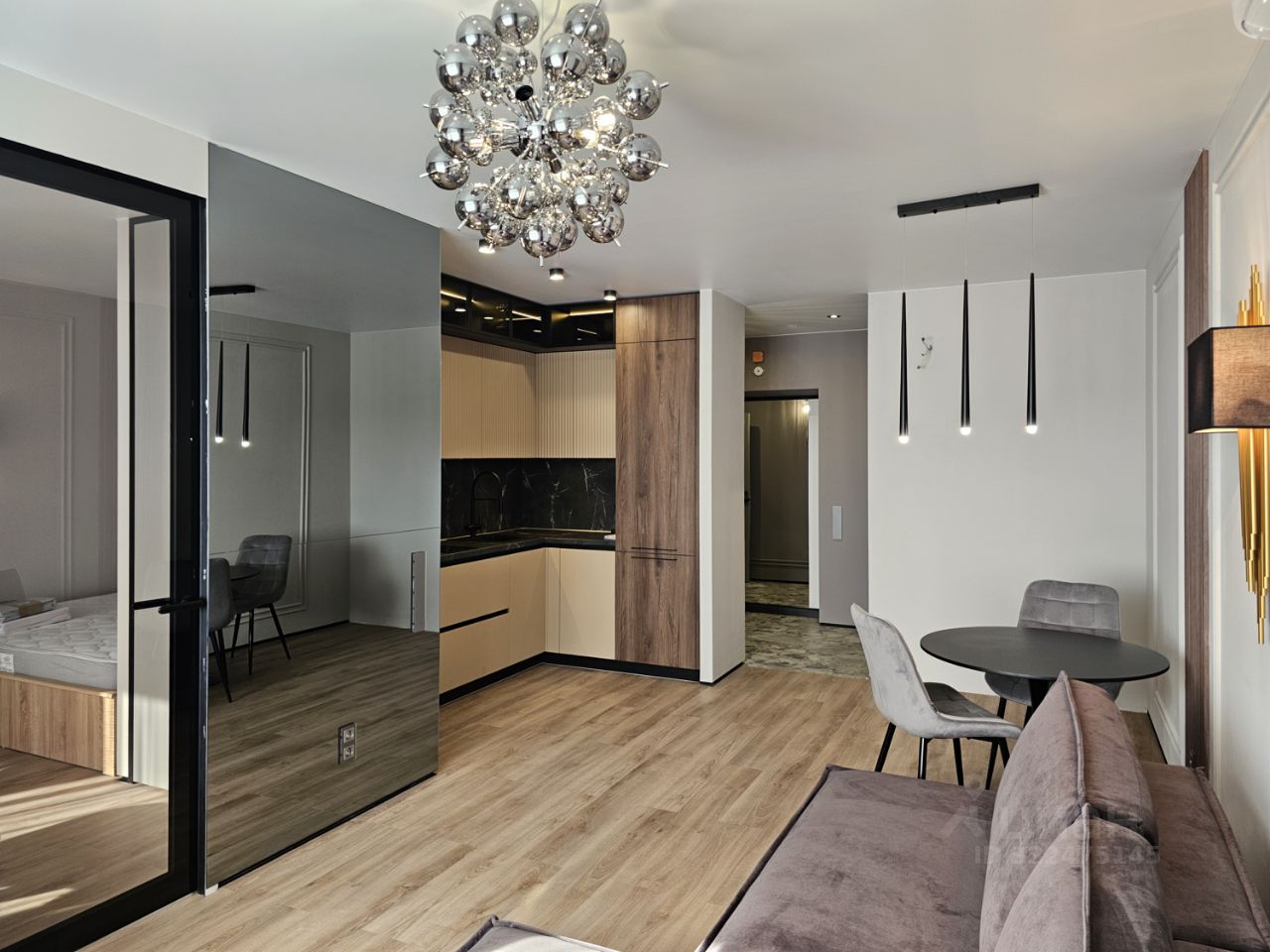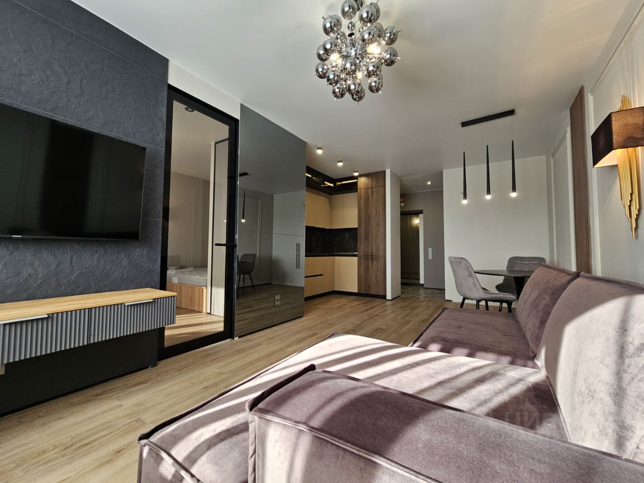 Сенсорные выключатели, атмосферная подсветка в спальне, на кухне и в санузле.