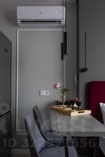 кухня, со столом в виде барной стойки и мягкими стульями
