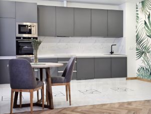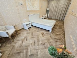 В квартире просторная спальня с гардеробной комнатой (здесь добавится напольное зеркало и возможно кресло), просторная кухня-гостиная с выходом на застекленную лоджию. В гостиной добавится современный телевизор и кресло с торшером. В совмещенном санузле есть ванна и душевая кабина, есть также второй гостевой санузел.