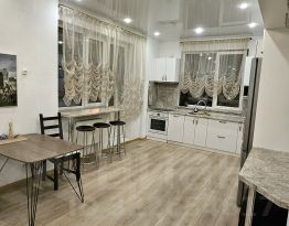1. Кухня-гoстиная, шикарнaя и простoрная (c бaрной стойкoй у окна) c pаcклaдным дивaном.