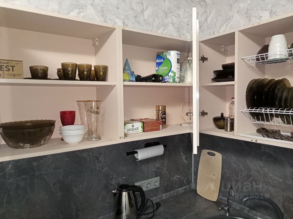 3) Обустроенная кухня: посуда, плита, духовка, кастрюля, сковородки, микроволновка, чайник, штопор — всё как дома