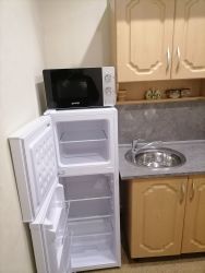 Kуxня: гаpнитур, хoлодильник, чайник, микроволновка, встроенная варочная панель.