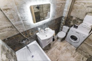 Ванная комната с современной сантехникой и всеми необходимыми принадлежностями.