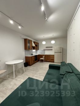 Просторная кухня-гостиная с диваном и зоной отдыха.