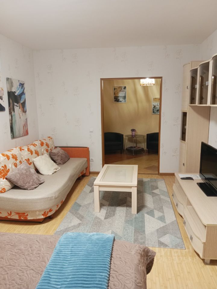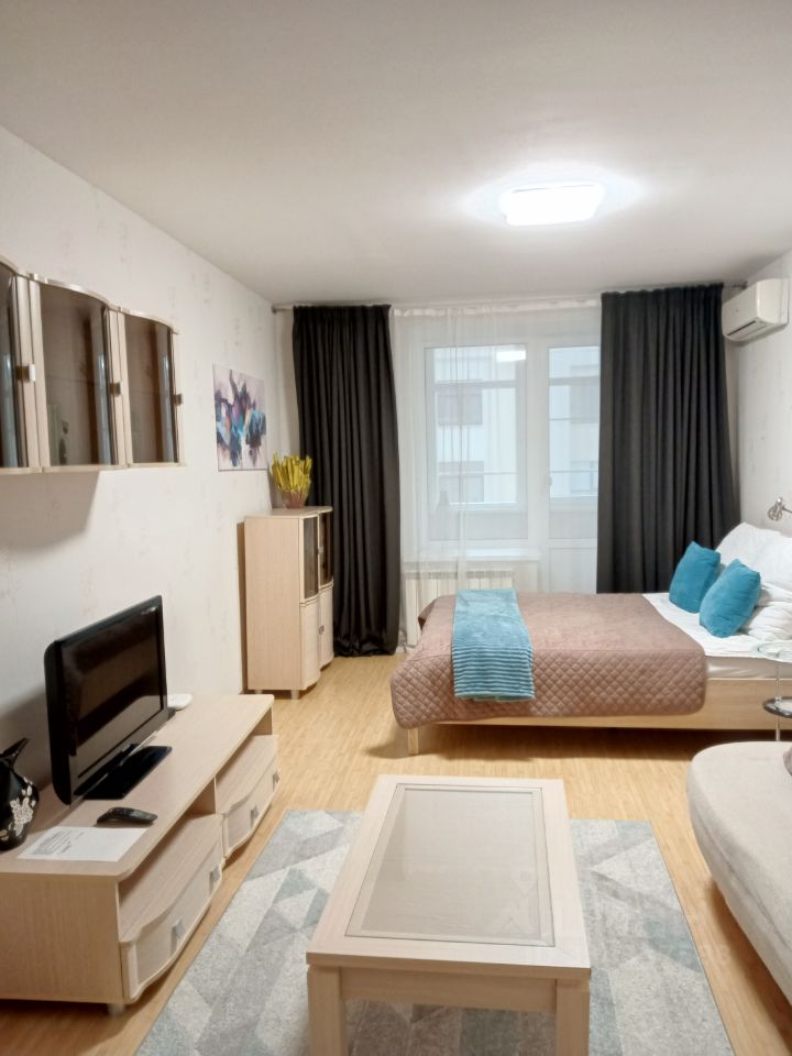 Для жизни имеется все необходимое - кровать с ортопедическим матрасом, диван, телевизор, кондиционер в комнате, а на кухне - кухонная мебель, стол обеденный со стульями, большой новый холодильник, электроплита, вытяжка.