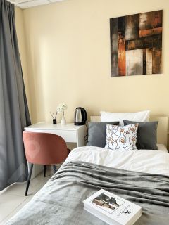 Номер укомплектован 1,5-спальной кроватью, небольшим рабочим столом, шкафом для одежды, пуфом и электрическим чайником. Для Вашего удобства так же предусмотрен и индивидуальный комплект полотенец и тапочек.