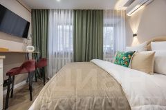 Уютная студия площадью 25 м² на 3 этаже. Идеально подходит для семьи из 3 человек, командированных или туристов, приехавших небольшой компанией, желающих насладиться комфортом. Спальные места: двуспальная кровать (160200 см, ортопедический матрас), односпальный диван (120200 см). Спальные комплекты: На каждую кровать и диван идет следующий комплект: 2 подушки; 2 наволочки; двуспальное одеяло; пододеяльник; простынь. Удобства: кондиционер, обеспечит вас комфортом в летний период; общественная парковка около дома; скоростной Wi-Fi для работы и развлечений; полностью оборудованная кухня (холодильник, плита, СВЧ-печь, чайник, набор посуды); стиральная машина; просторная ванная комната с душевой кабиной, мягкими полотенцами и феном; гигиенические наборы: мыло, шампунь, гель для душа, ватные палочки, ватные диски, прокладки, зубные щетки; комплимент для гостей: чай, кофе, соль, сахар, конфеты и подсолнечное масло; постельное бельё из натуральных тканей.