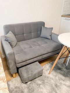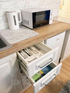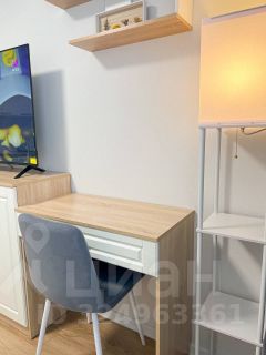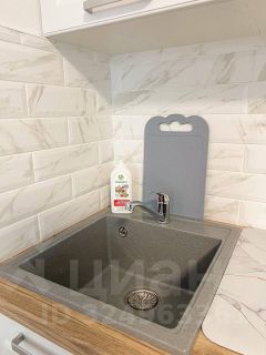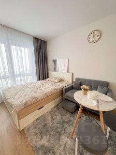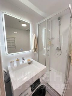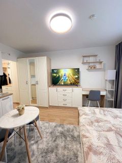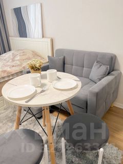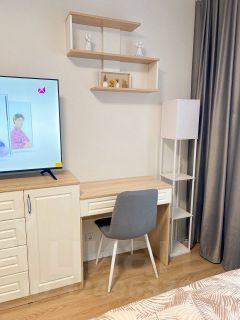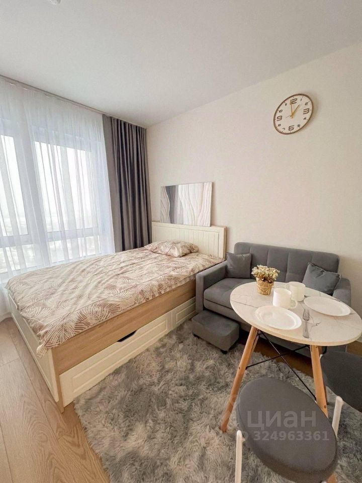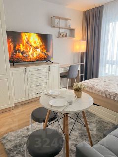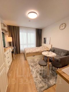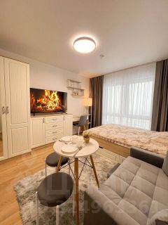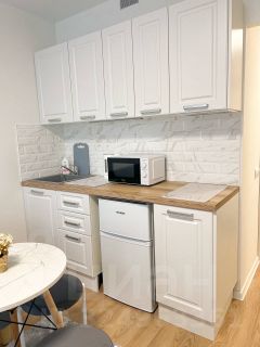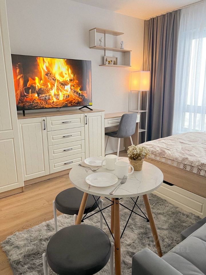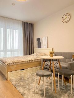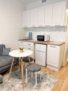 Студия оборудована всем необходимым для комфортного проживания: вместительный шкаф, удобный диван и обеденный стол. В квартире установлен современный телевизор с подключением к интернету. Кухня оснащена всей необходимой техникой: микроволновая печь, плита, холодильник и стиральная машина. Санузел совмещённый, выполнен в светлых тонах, с душевой кабиной и современной сантехникой.