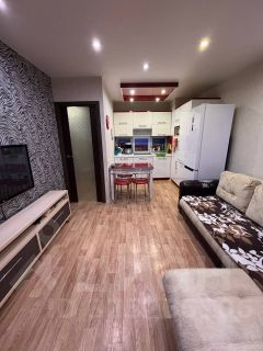 Комнаты мебелированы, на кухне и в жилой зоне есть необходимая мебель. Установлена современная техника: кондиционер, холодильник, телевизор, стиральная машина, поэтому можно переехать без лишних хлопот. Санузел совмещенный и оборудован ванной. Окна выходят во двор, что обеспечивает тишину и уют.