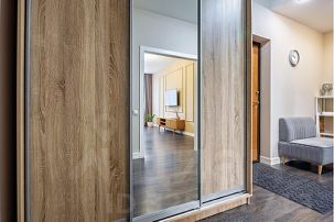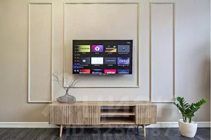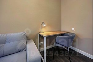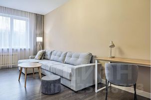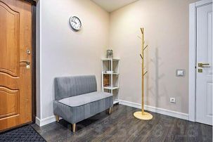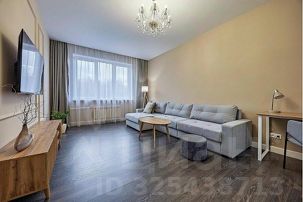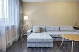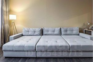 В зале установлен современный большой диван с простой системой раскладывания "Еврокнижка". Диван имеет текстильную обивку и ровную поверхность в разложенном состоянии с оптимальной упругостью, что гарантирует на нем комфортный ежедневный сон. Напротив дивана на стене большой Smart TV. Для работы имеется просторный письменный стол с лампой и комфортным мягким стулом. На окнах плотные шторы и москитные сетки в летний период