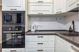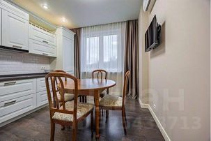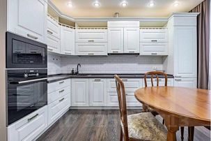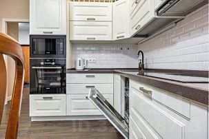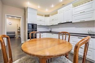 Кухня имеет очень богатое оснащение. Качественный кухонный гарнитур со встроенной техникой: микроволновая печь, духовой шкаф, посудомоечная машина, индукционная плита, вытяжка, холодильник с морозильной камерой. Имеется вся посуда и кухонна