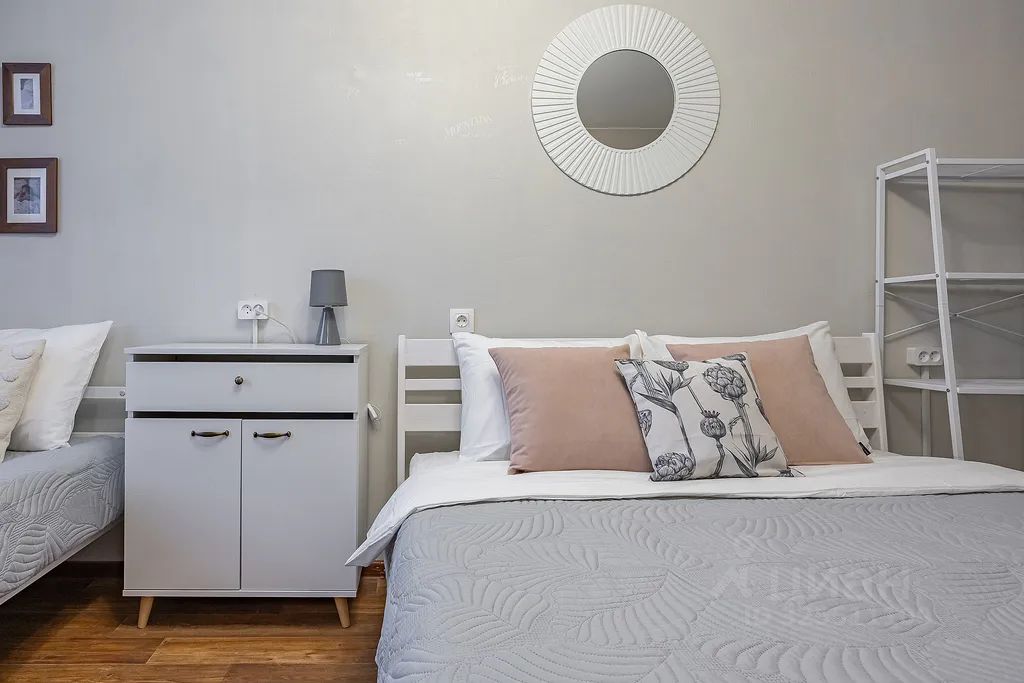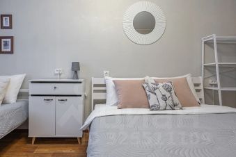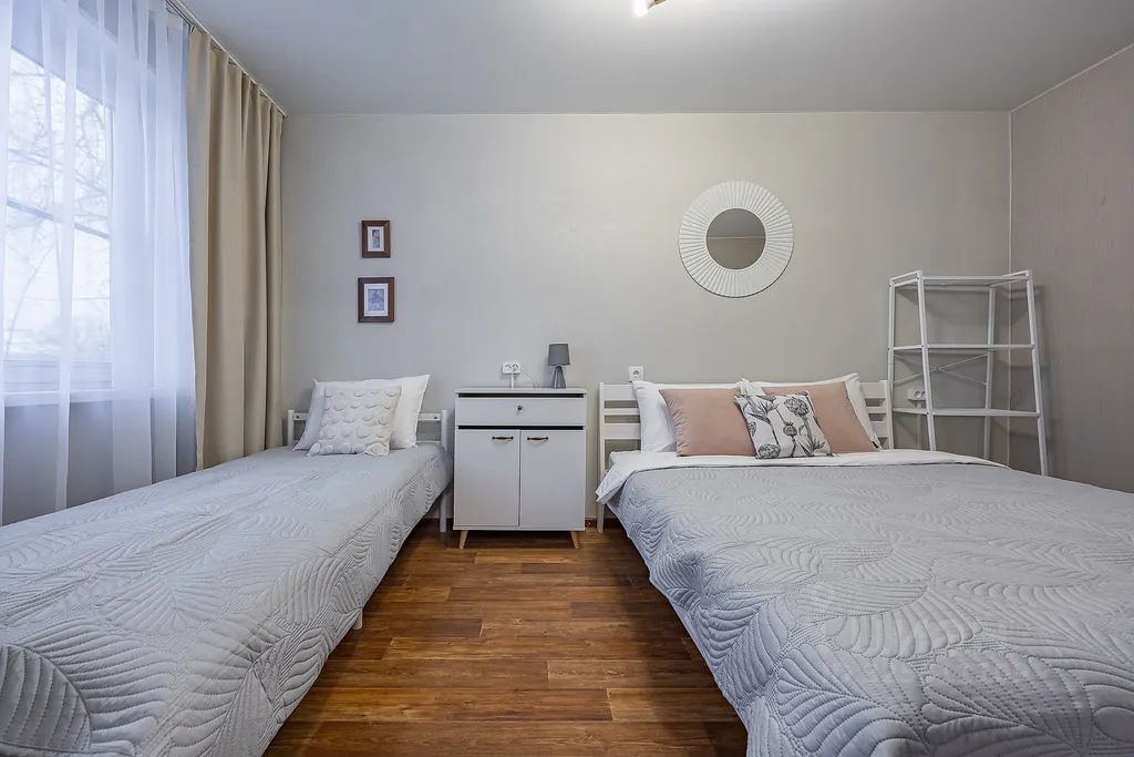 Пять спальных мест: двуспальная кровать, односпальная и раскладной диван. Квартира предназначена в первую очередь для семей или пар. Проживание пяти взрослых человек в ней исключено. Проживание с домашними животными возможно за дополнительную плату.
