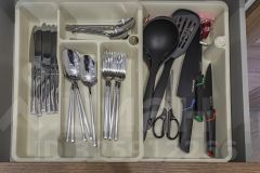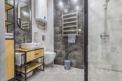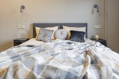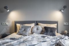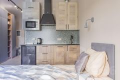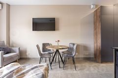 Двуспальная кровать, раскладное кресло-кровать. По запросу, заранее, возможность разделить двуспальную кровать на две односпальные. Оборудованная кухня с техникой: холодильник, плита, микроволновая печь, чайник, посудомоечная машина, посуда для приготовления еды. Также в апартаментах кондиционер, фен, стиральная машина, утюг, телевизор, wi-fi. Собственная ванная комната с душем. Предоставляется постельное белье и полотенца.