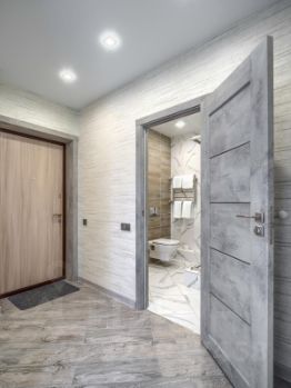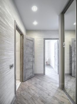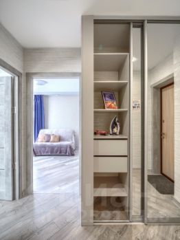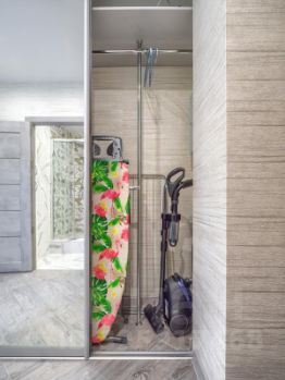 В прихожей располагается вместительный шкаф. В нем вы найдете утюг, фен, гладильную доску, сушилку для белья, а также пылесос. На кухне можно найти всю необходимую посуду для приготовления семейного ужина.