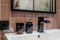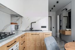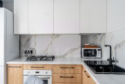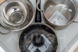 - Полноценно укомплектованная кухня: газовая плита, духовка, чайник, микроволновая печь, холодильник, гейзерная кофеварка, посуда и столовые приборы, фильтр-кувшин