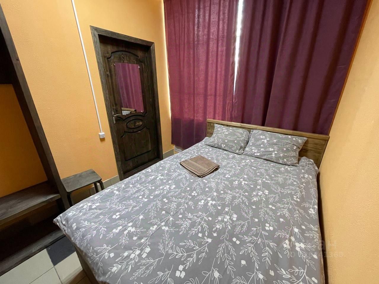 В номере большая двуспальная кровать, шкаф и тумба, чайник и чайные принадлежности.