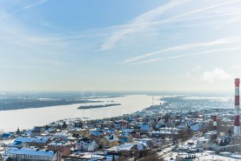 Светлая кухня-гостиная с мягким диваном и панорамным видом на город и реку
