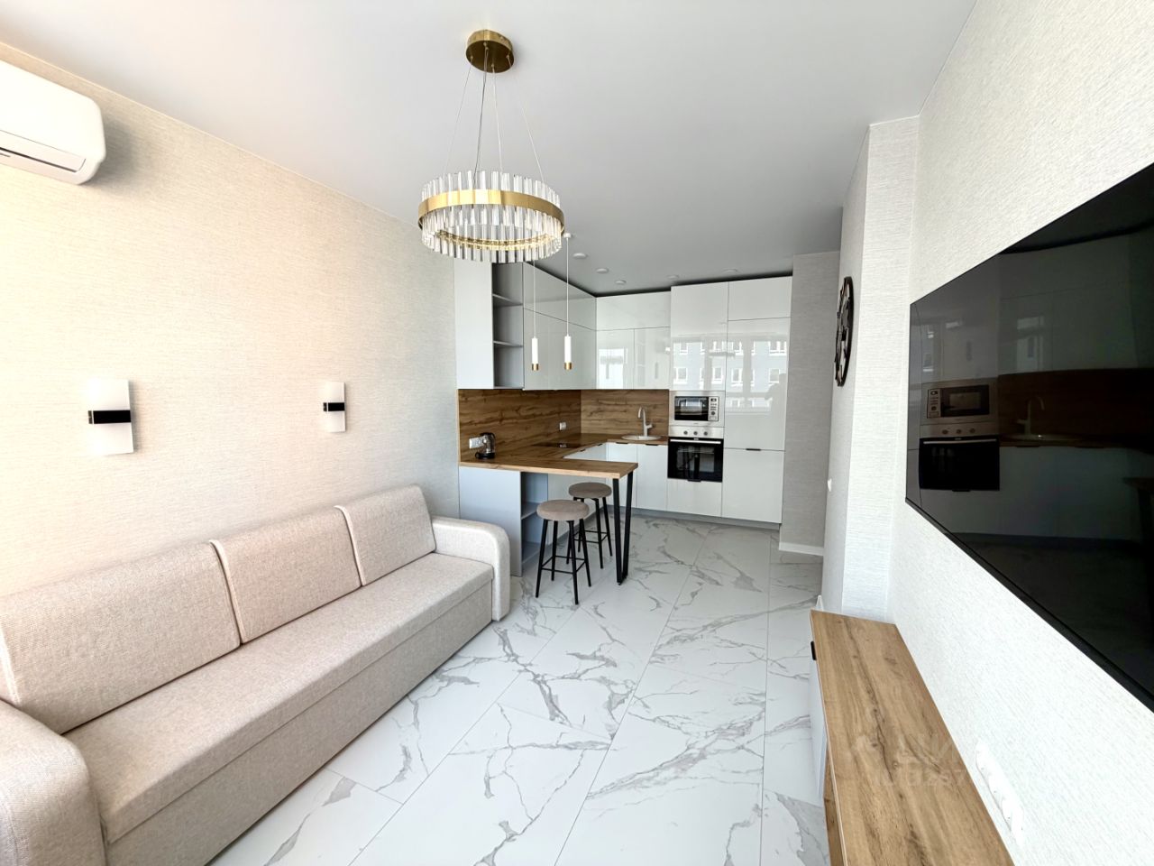 В квартире никто не жил , вся мебель и техника новые. Кухня оборудована современной техникой, включая холодильник, микроволновую печь, духовой шкаф, кондиционер, посудомоечную машину и электрический чайник. Так же в квартире два телевизора со Смарт ТВ.