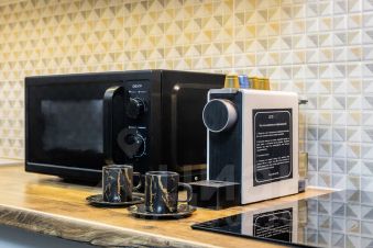 Квартира оснащена всей необходимой техникой, посудой и столовыми приборами.