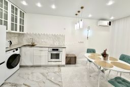 Кухня со встроенным кухонным гарнитуром и бытовой техникой, имеются стол и стулья, уютная обстановка. Функциональная прихожая - 4,8 кв.метров;