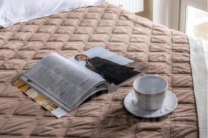 На каждую кровать или диван — полноценный комплект (2 подушки, 2 наволочки, двуспальное одеяло, пододеяльник, простыня,, полотенце 70*130 см. )