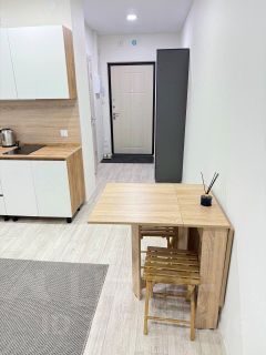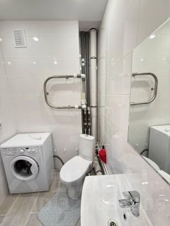 В квартире сделан современный евроремонт. Пространство студии организовано продуманно: есть удобная мебель как на кухне, так и в комнате. Кухня площадью 5 кв. м оснащена необходимой техникой, включая холодильник и стиральную машину. В ванной комнате установлена ванна, что особенно приятно для любителей расслабиться после рабочего дня.