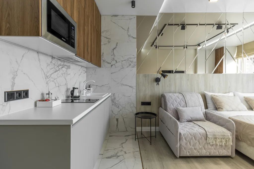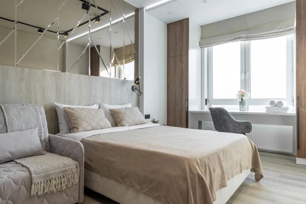 Стильные апартаменты "Отражение" 709 площадью 26 м² в центре города — пространство с выразительным интерьером и эффектной игрой света, где каждая деталь создаёт атмосферу уюта и визуальной глубины. Номер сочетает современный дизайн и функциональность, обеспечивая комфортное проживание как для отдыха, так и для деловых поездок.