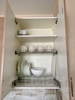 Современная кухня с посудой и необходимой техникой, включая посудомоечную машину, холодильник, плиту, чайник, микроволновую печь, что позволит вам готовить собственные блюда