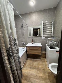 Совмещенный санузел оформлен в светлых тонах и оснащён ванной. Из окон открывается потрясающий вид на город.