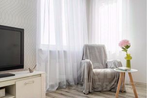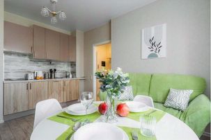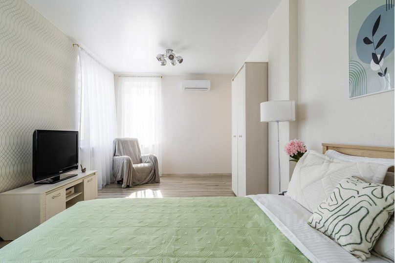 Квартира полностью меблирована и оборудована всем необходимым для комфортного проживания. В ней есть удобная двуспальная кровать с ортопедическим матрасом, односпальный диван. Интерьер квартиры выполнен в современном стиле с использованием приятных и теплых оттенков.