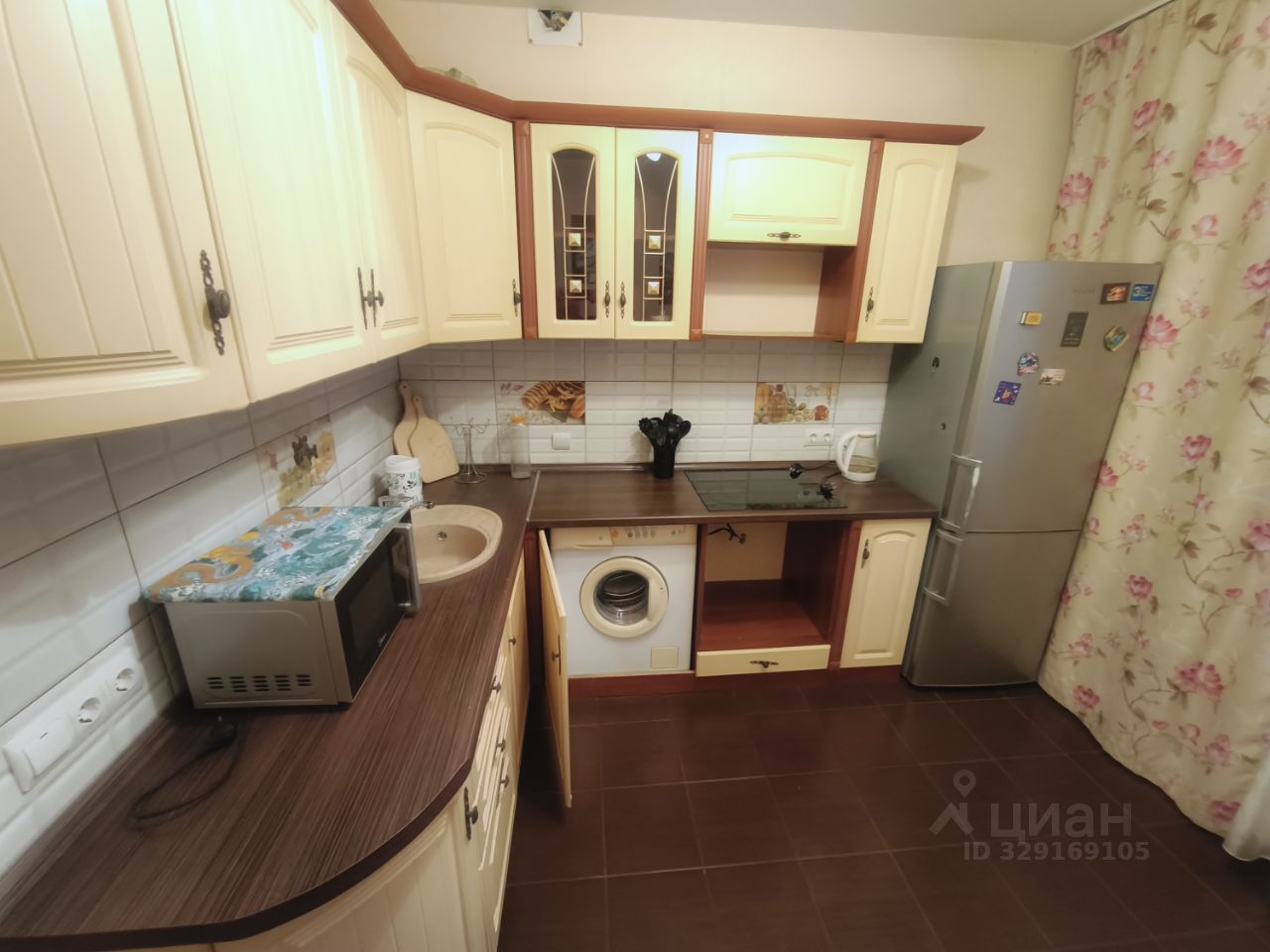 КУХНЯ: двухкамерный холодильник, микроволновка, варочная поверхность, кухонный гарнитур с мойкой, обеденный стол и стулья, стиральная машина. Дополнительно имеются посуда, фен, утюг, сушилка для белья, гладильная доска, электрочайник.