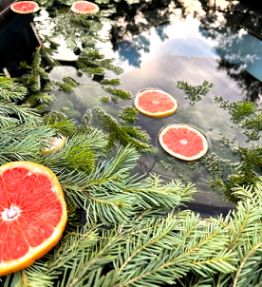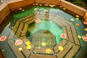 - Сибирский банный чан с подогревом на открытом воздухе, в котором вода прогревается до 37 градусов. (Растопка чана зимой составляет около 5-6 часов, поэтому просим Вас заказывать заранее, к нужному времени.)
